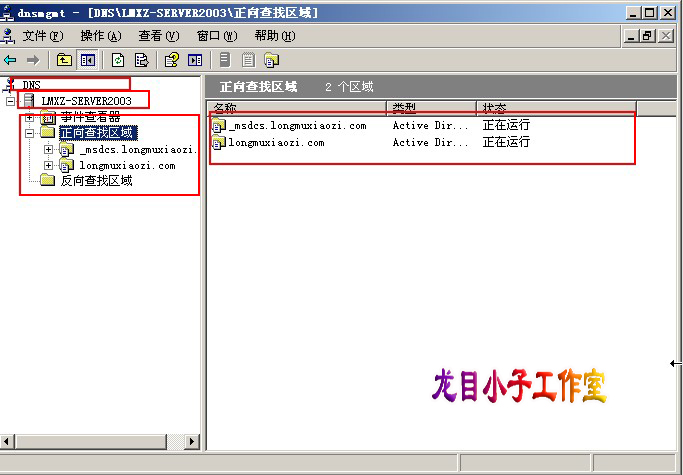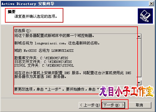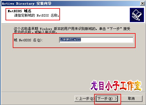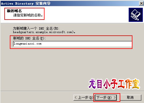 此时弹出“新的域名”向导页,在此为要创建的域指定DNS 名称,我此处指定的DNS 名为longmuxiaozi.com,单击“下一步”,继续……