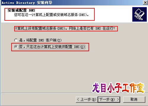 由于我的网络总没有任何的DNS 服务器,所以在此会提示安装或配置DNS,在此我就直接将DNS 安装到域控制器上了,选“否,只在这台计算机上安装并配置DNS”,单击“下一步”,继续……