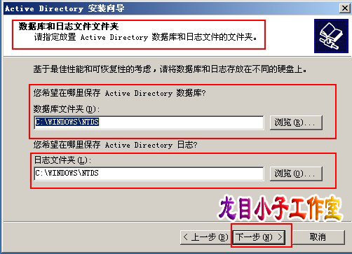 考虑,最好不要将活动目录数据库和日志放在同一个分区,而且要确保活动目录日志所在的分区必须有足够的剩余空间。如下图所示,设置好后,我们单击“下一步”,继续……