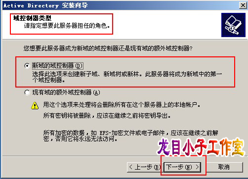 此时,弹出“域控制器类型”向导页。在此选择域控制器的类型是“新域的域控制器”和“现有域的额外域控制器”。因为这是我的网络中的唯一的一台域控制器,而且这是目录林中根域的第一台DC,所以此处应选择“新域的域控制器”单选按钮,然后单击“下一步”,我们继续……