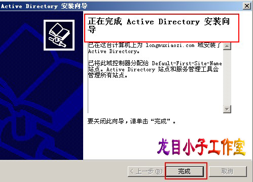 根据计算机的配置不同,活动目录的安装过程可能需要几分钟或几十分钟的时间,安装完成后会看到完成界面,此时此刻,我们需要的就是耐心的等待……