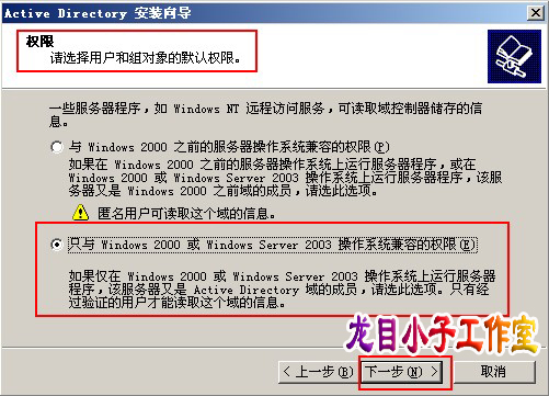 此时出现“操作系信息统兼容性”向导页。在此提示关于操作系统的兼容性的兼容性的信息。为了更好的利用Windows Server 2003 所提供的安全特性,建议域中的成员服务器的操作系统最好是Windows 2000 以上版
