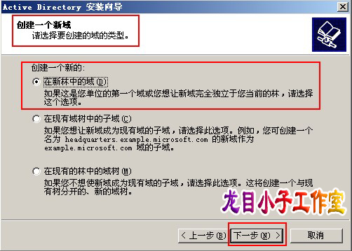 此时提示我们“创建一个新域”,在此选择要创建的域的类型,此处选择“在新林中的域”,单击“下一步”,继续……