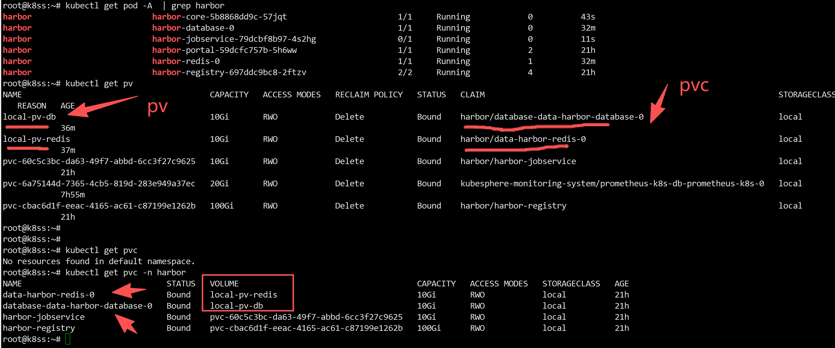 - Harbor 启动失败的本质:数据库和 Redis 的 PVC 没找到对应的 PV(类似 Docker 中挂载目录不存在),导致依赖它们的核心服务启动失败。