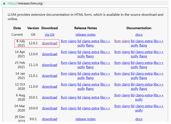 现在最新LLVM版本号已经到了12.0.1版本,官方地址如下: