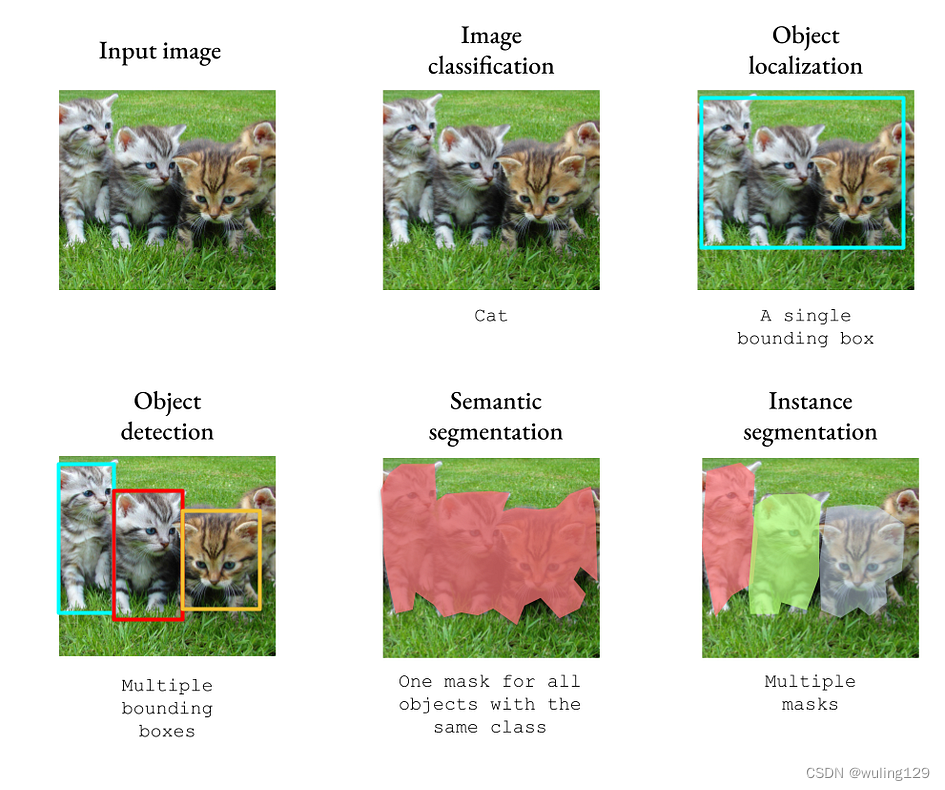 下图显示了这些计算机视觉任务之间的差异。为了简化问题,我们仅考虑一个类别和一个标签的分类。