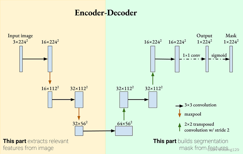 编码器-解码器之所以相关,是因为它们产生了与我们想要的类似的输出:具有与输入相同维度的输出。我们是否可以将编码器-解码器的概念应用于图像分割?我们可以生成一个一维的二进制掩模,并使用交叉熵损失来训练网络。