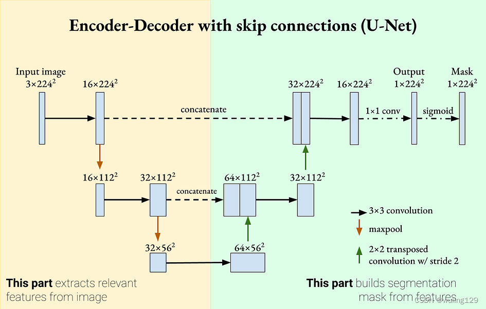 U-Net 是一个带有跳跃连接的编码器-解码器分割网络。作者提供的图片。U-Net 具有两个定义特性: