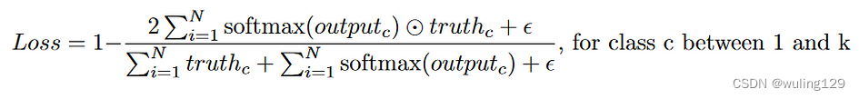 在这里,添加了一个 epsilon 项以避免除以0(epsilon 通常为1)。一些实现,如Milletari等人的实现,在求和之前会将分母中的像素值平方[3]。与交叉熵损失相比,Dice 损失对于不平衡的分割掩模非常鲁棒,这在生物医学图像分割任务中很常见。