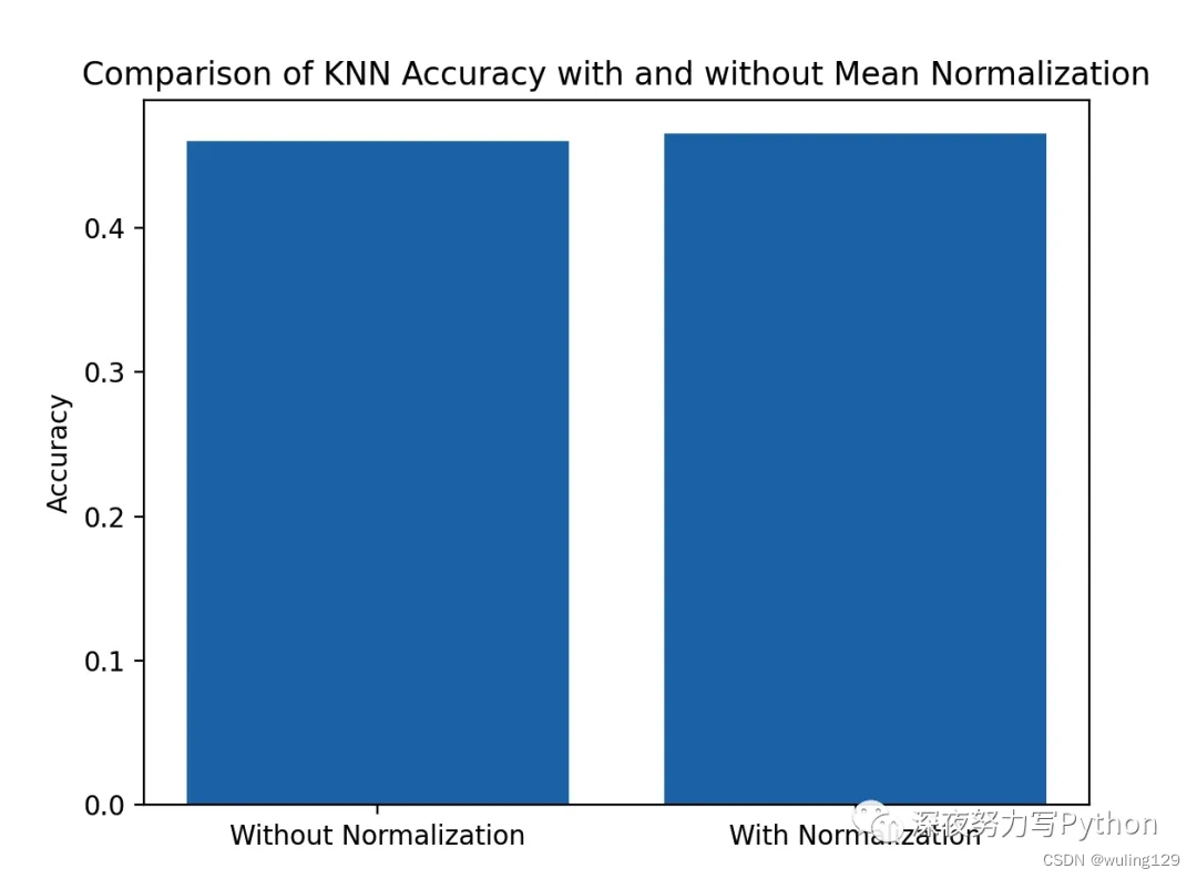最后,通过绘制的柱状图可以直观地比较归一化前后KNN算法的准确率,从而验证均值归一化对模型性能的影响。