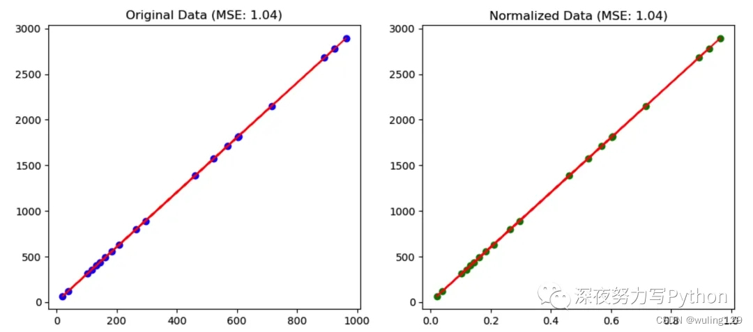 上述代码中,我们首先生成了一个简单的线性关系数据集。然后,我们对这个数据集应用了小数定标归一化,并使用线性回归模型在归一化前后的数据上进行了训练和测试。