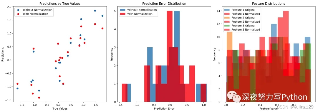 预测误差分布:通过直方图展示了归一化前后预测误差的分布情况,有助于理解模型性能的提升。
