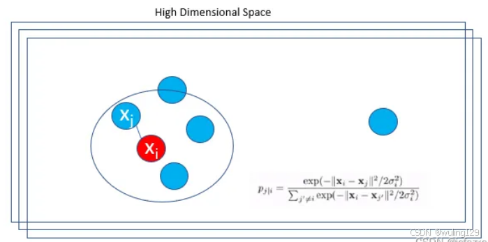 t-SNE 将数据点 xᵢ 和 xⱼ 之间的高维欧氏距离转换为条件概率 P(j|i)。