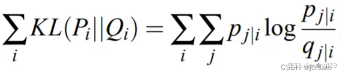 Pᵢ 表示点 xᵢ 在所有其他数据点上的条件概率分布。 Qᵢ 表示给定地图点 yᵢ 的所有其他地图点的条件概率分布