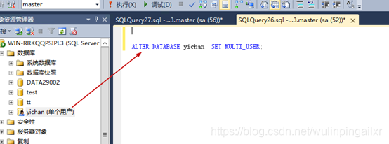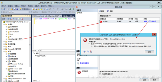 恢复完成后删除此yichan数据库,且变为单用户模式(报错如下):