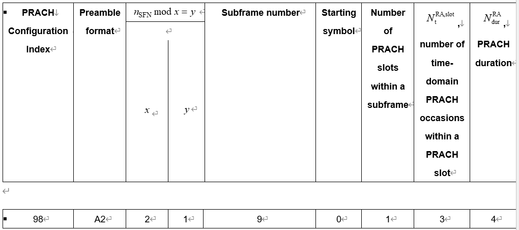 is the PRACH transmission occasion within the PRACH slot, numbered in increasing order from 0 to within a RACH slot where is given Tables 6.3.3.2-2 to 6.3.3.2-4 for and fixed to 1 for ;