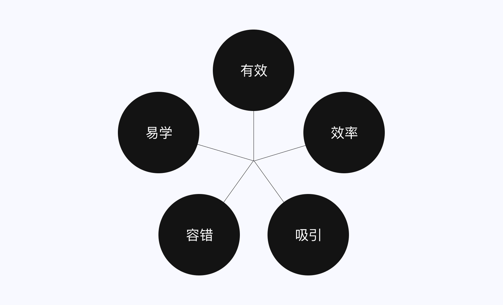 该模型是讲述用户使用产品的感受,它包含五个维度:有效(Effective)、效率(Efficient)、吸引(Engaging)、容错(Error tolerant)、易学(Easy to learn),我们看每个维度的英文解释,会发现首字母都是E开头,所以被称为5E体验设计模型。