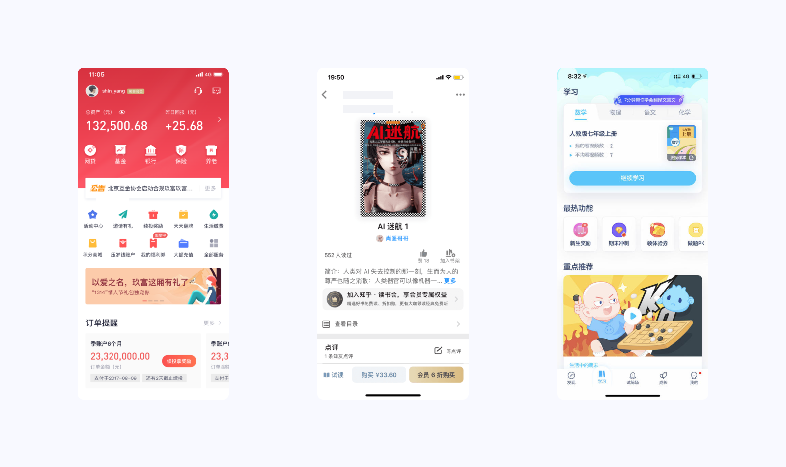 一个产品通过不同的视觉表现或者音乐效果能够加强用户在感知层的认知,不同的群体,不同的阶段,所展示的风格不同,像下图中的金融产品,使用红色为主色传递的感觉是积极向上的感知,因为在国内股票和基金里红色代表涨,在看阅读产品和教育产品,都根据产品特性和用户群体来设定风格,试想一下,一个阅读的软件做成卡通风格,那会不会严重影响阅读呢。