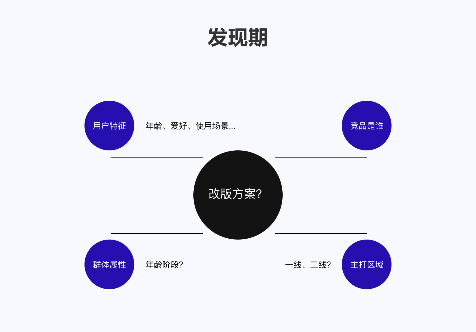 例如我们要做一个唱歌产品的改版,站在设计师的角度我们需要去定义他的基本风格和基本色彩规范等等,但是总不能上来就去做设计吧,我们要知道我们产品的群体是谁?具体的用户属性是什么样的?有什么样特征呢?等等。这个阶段就是“双钻模型”的第一个阶段,发现期。
