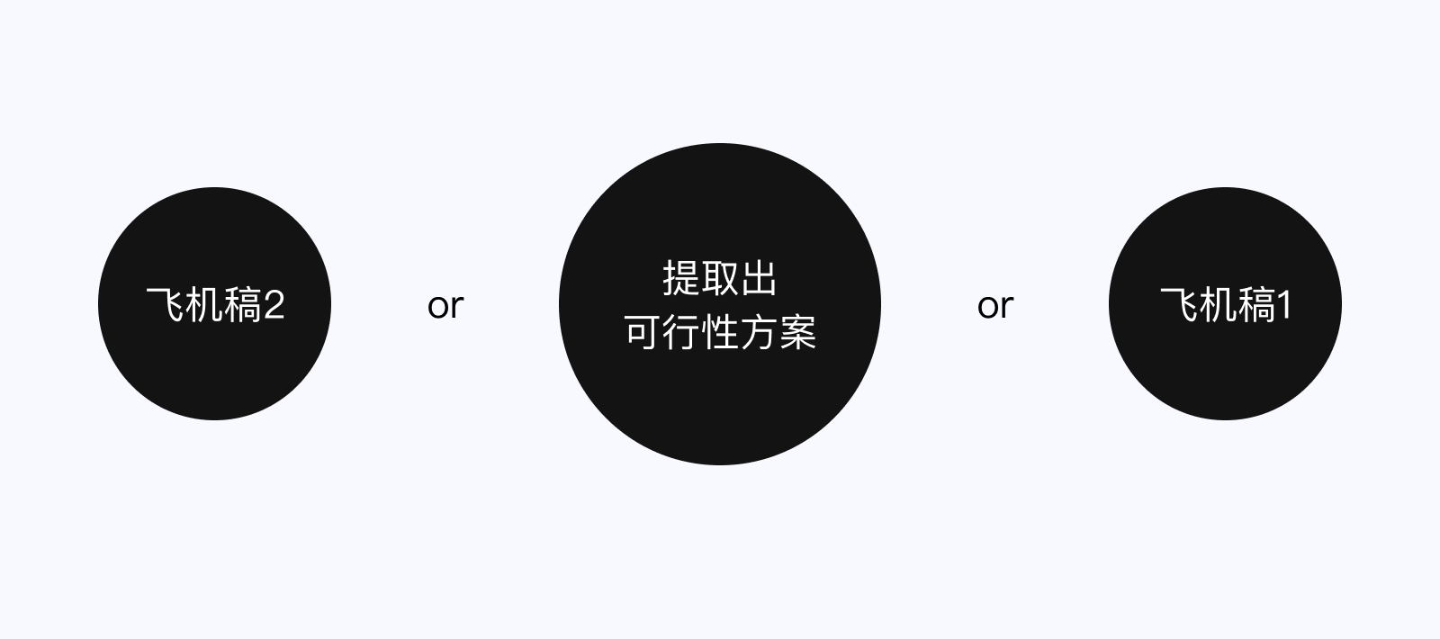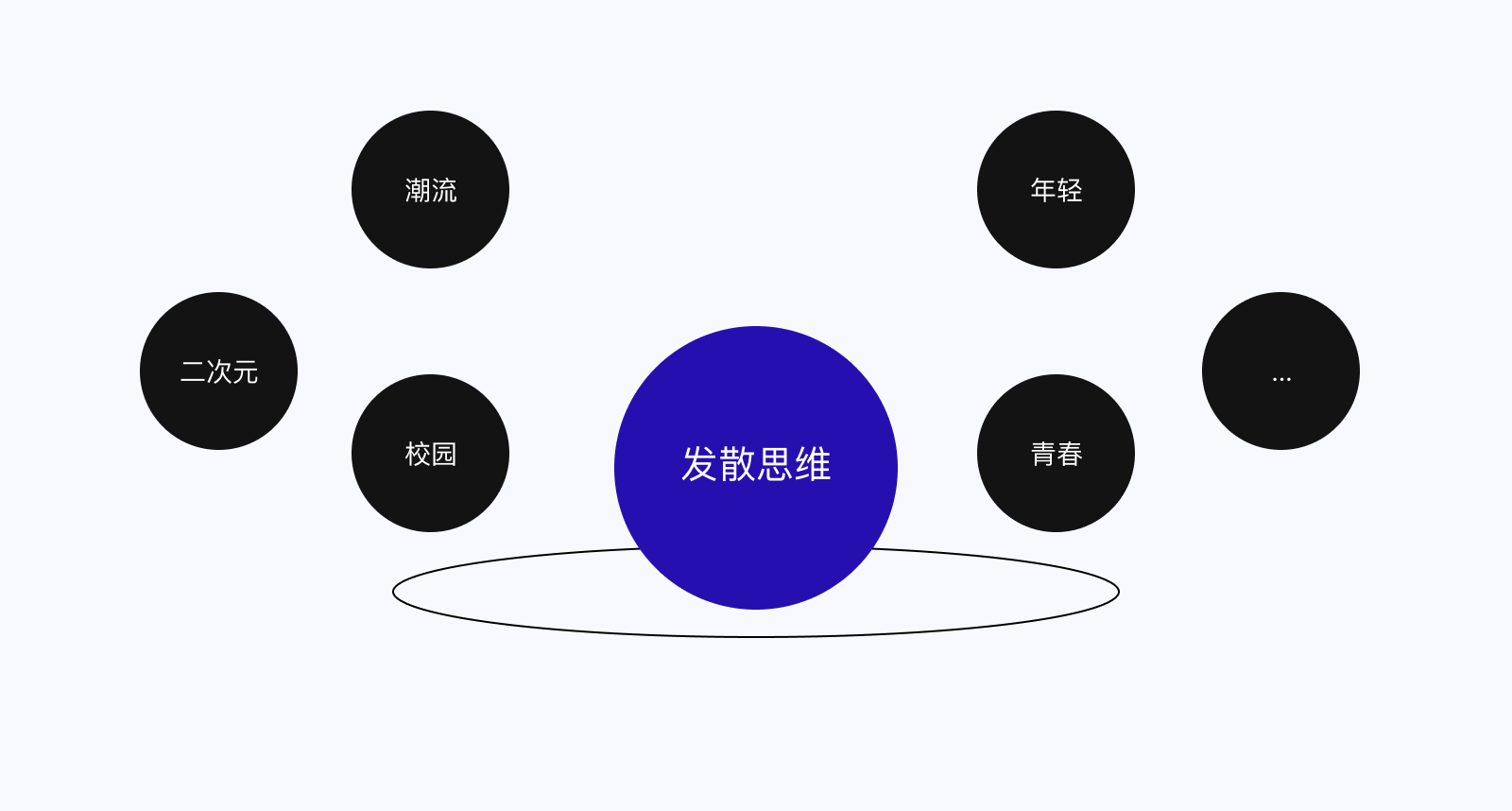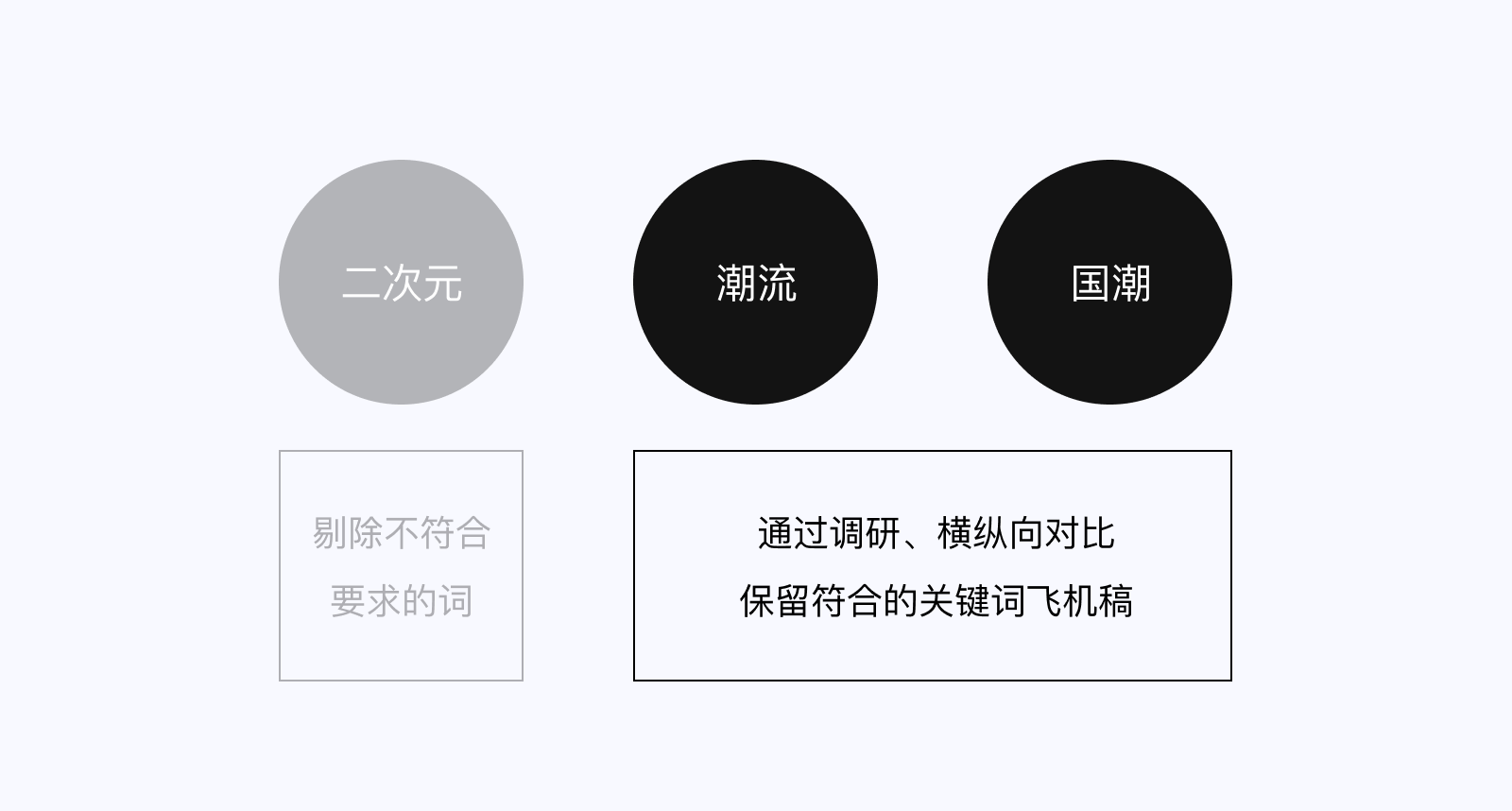 我们按照年轻、二次元、潮流、国潮这些关键词出了一些飞机稿,我们需要去收拢起来看看那些可以与产品特性和用户属性真正具有关联性,假设用户群体虽然是18-25岁的学生,但是我们通过访谈和其他调研方式发现这类群体中喜欢二次元歌曲的群体偏少,而潮流、国潮等关键词更符合这类群体定位,并且也能够跟产品的主打方向匹配上,那么就可以剔除二次元相关的飞机稿了。