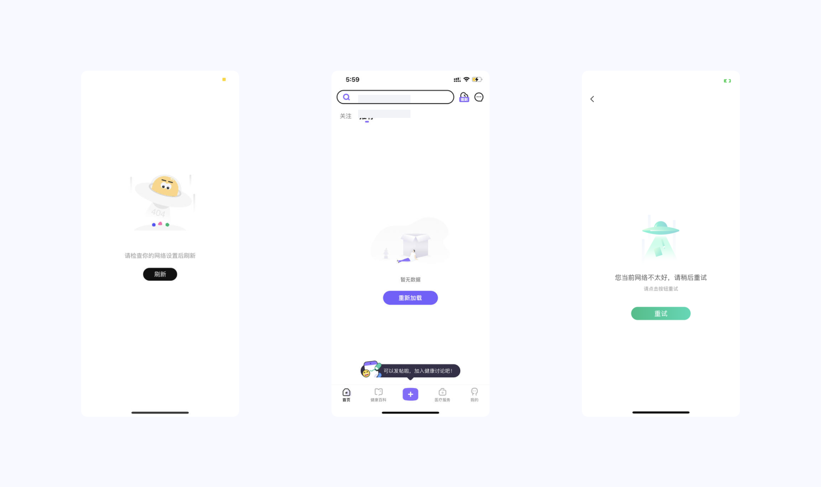 在产品中也会有相关的功能,例如聊天页面中,我们因为网络因素发送失败会进行红点提示,包括一些内容加载失败会提示重新加载等等。