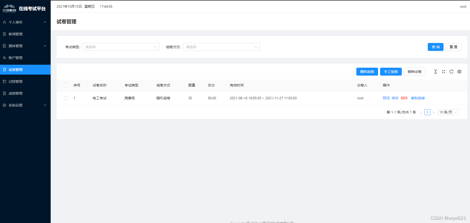在线考试系统采用springboot+Vue+mysql5.7技术栈,实现全面计算机自动化考试和学习,支持试题导入、组卷、评卷及成绩查询等功能,打造一体化的综合考试学习平台。