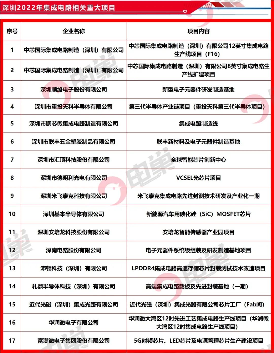 2022年5月,深圳发改委发布《深圳市2022年重大项目计划清单》,其中有十余个半导体相关的重大项目: