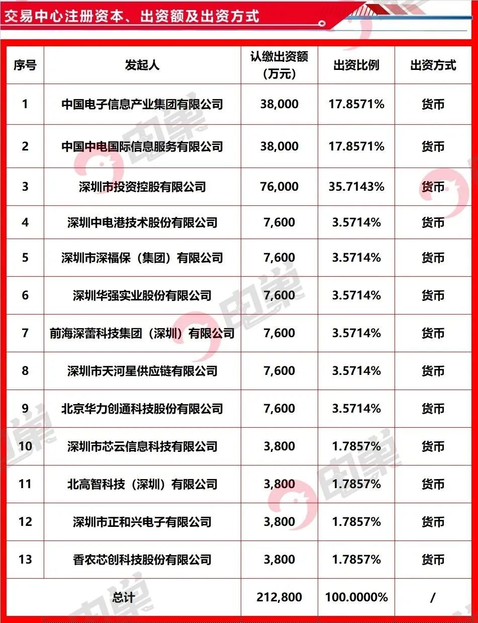 电巢从相关公告中获悉,电子元器件和集成电路国际交易中心由中国电子和深投控领衔发起,共计13家央企、国企和民营企业出资成立,形成国资国企主导、多种类型主体共同建设的格局,其中中国电子信息产业集团有限公司与中国中电国际信息服务有限公司、深圳市投资控股有限公司为三大主要出资人,三家总出资额占比达 71.43%。