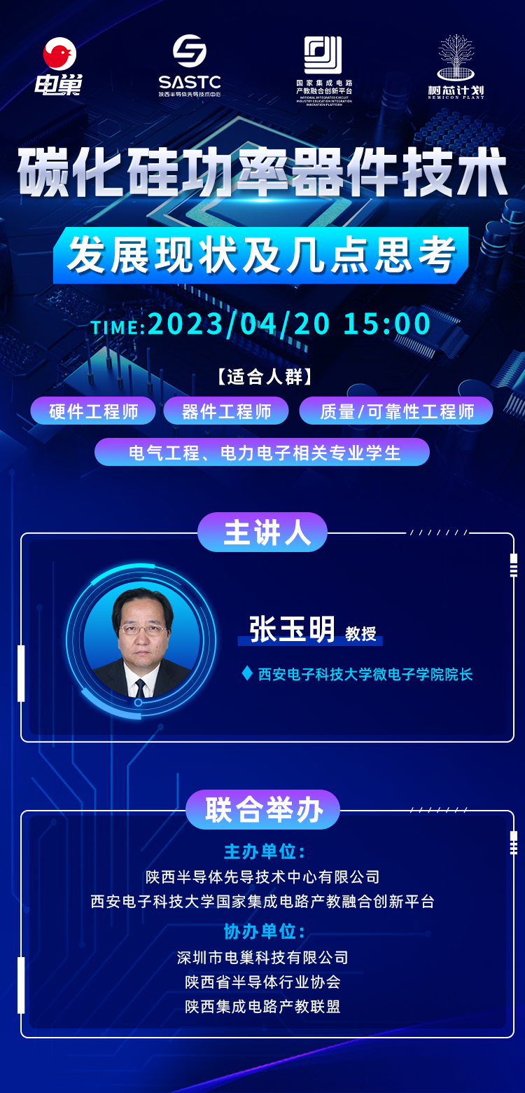 4月20日,陕西半导体先导技术中心开展了首期“树芯计划”大讲堂系列公开课。围绕“树芯计划”的首期活动主题,电巢科技、西安电子科技大学和陕西半导体先导技术中心就《碳化硅功率器件技术发展现状及几点思考》主题展开线上直播,与此同时,主讲人张玉明博士为理工科高校在校生、在职人员分享行业前景、发展方向、职业发展等热点问题,大家获益良多。