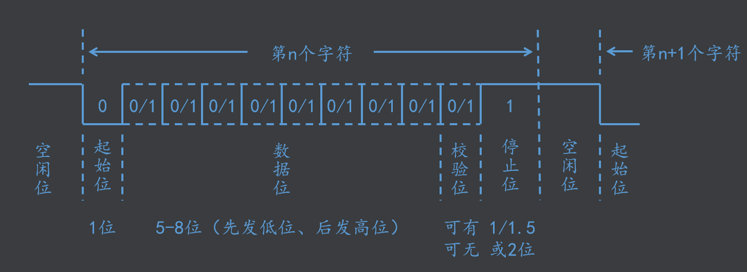 一个典型的 UART 帧结构如下:1 位起始位 + 5~8 位数据位 + (可选 1 位校验位) + 1~2 位停止位。