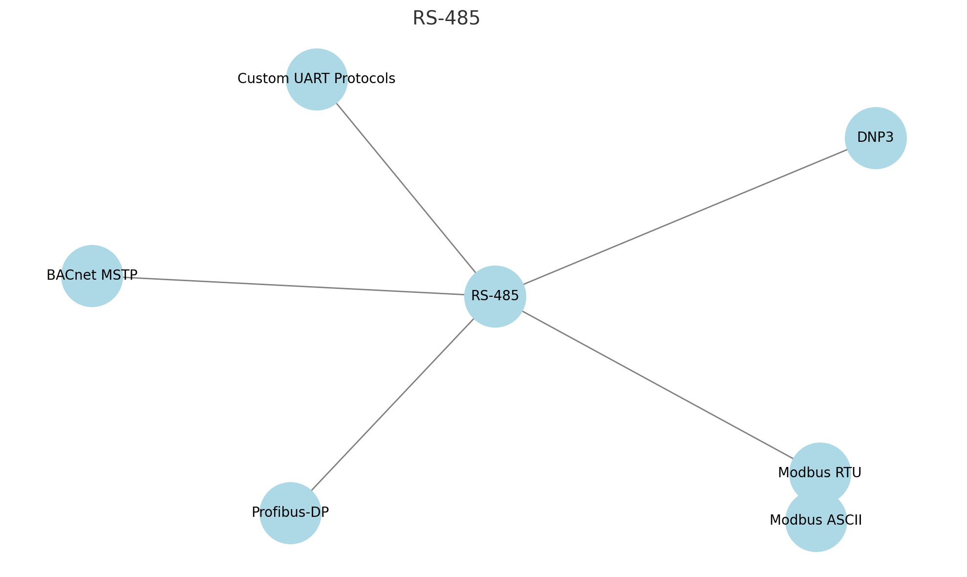 - 运行在其上的协议有: (1)Modbus RTU:工业领域最广泛应用的主从通信协议 (2)Profibus-DP:西门子主推的工业现场总线 (3)BACnet MSTP:楼宇自动化常用协议 (4)DNP3:电力与公用事业常见协议(可跑在 RS-485 或 TCP 上) (5)Custom UART Protocols:很多厂商也会基于 UART+RS-485 自定义协议栈