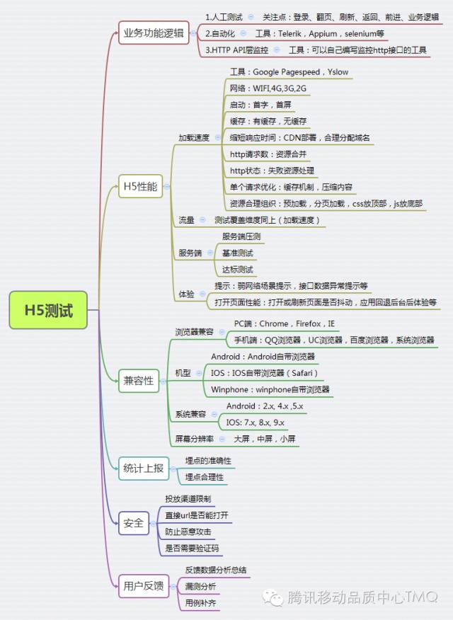 随着各种H5页面的普及和运用,并深深的影响着我们各个业务的发展,前两年也对H5测试的有着不少积累,但都是根据项目的要求,这里测试下,那里测试下,今年上半年专门成立了H5测试研究虚拟小组,专门研究怎么玩转H5测试,怎么最大程度的保证H5页面的质量,废话少说,直接上干货——一张图玩转H5测试,其目的在于,当一个测试者拿到一个H5业务的测试时,可以引导你怎么去思考来完整的测试你的业务,减少线上问题的出现: