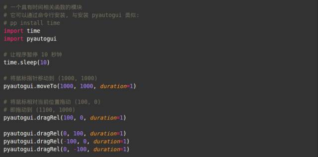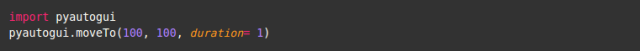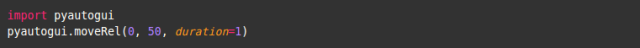 这段代码将鼠标指针从原位置相对地移动 (0, 50) 个像素点 (译注: 即向下移动 50 像素). 比如说, 运行代码之前, 鼠标指针在 (1000, 1000), 那么代码运行之后, 鼠标指针将移动到 (1000, 1050), 耗时 1 秒.