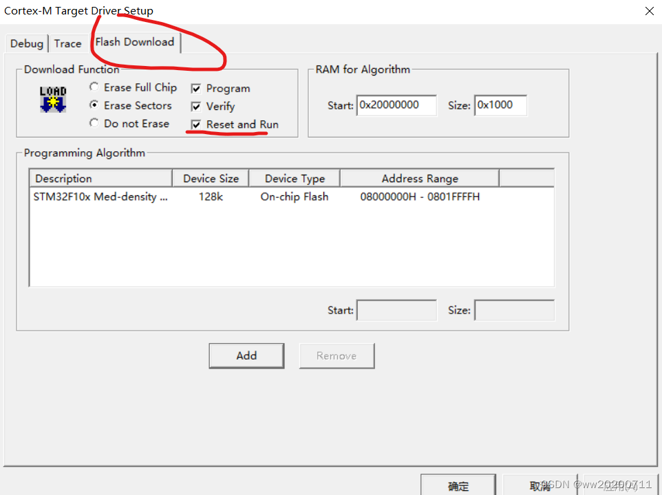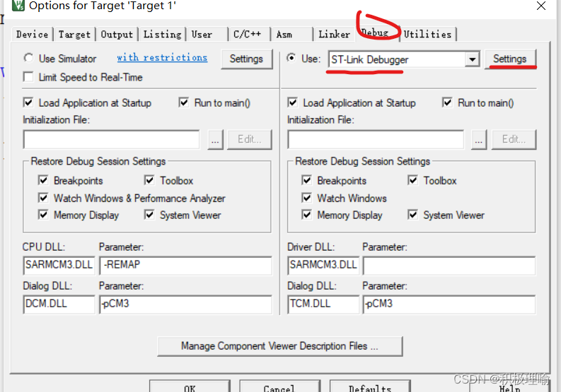 点击魔术棒,debug,选择ST-Link,setting。点击Flash Download,把Rest and Run勾选。