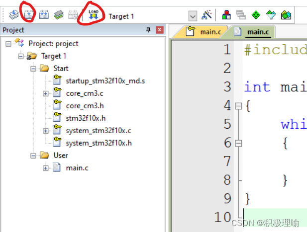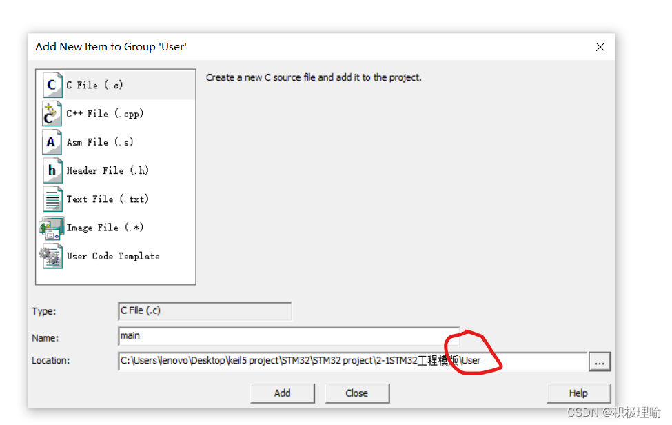 在工程模版下新建User文件夹,main函数就存放在这里。同时在Keil里Target下添加组,重命名为User,再新建main的文件。