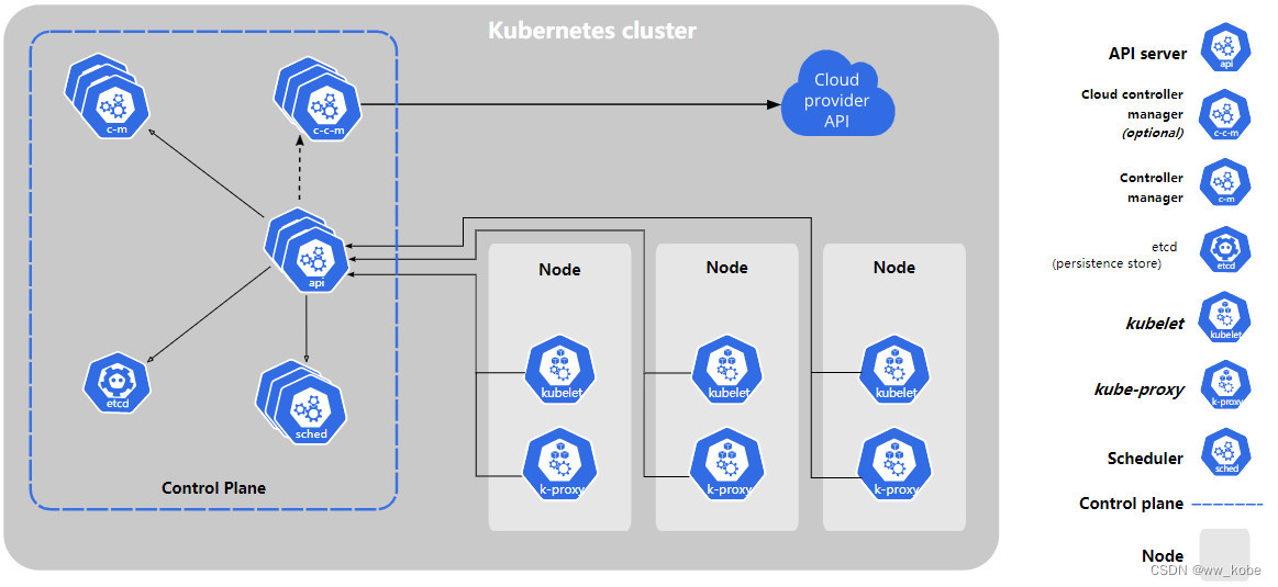 控制平面组件会为集群做出全局决策,比如资源的调度。 以及检测和响应集群事件,例如当不满足部署的 replicas 字段时,要启动新的 pod。