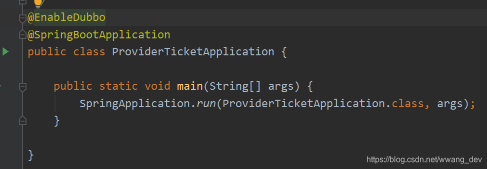 这个@EnableDubbo是我之后加上去的,好像是springboot 2.x之后的改变造成的,如果不加的话,之后我们在消费端的注入会失败(可能是null,反正我是直接报错了)具体大家试一下就知道了。 -