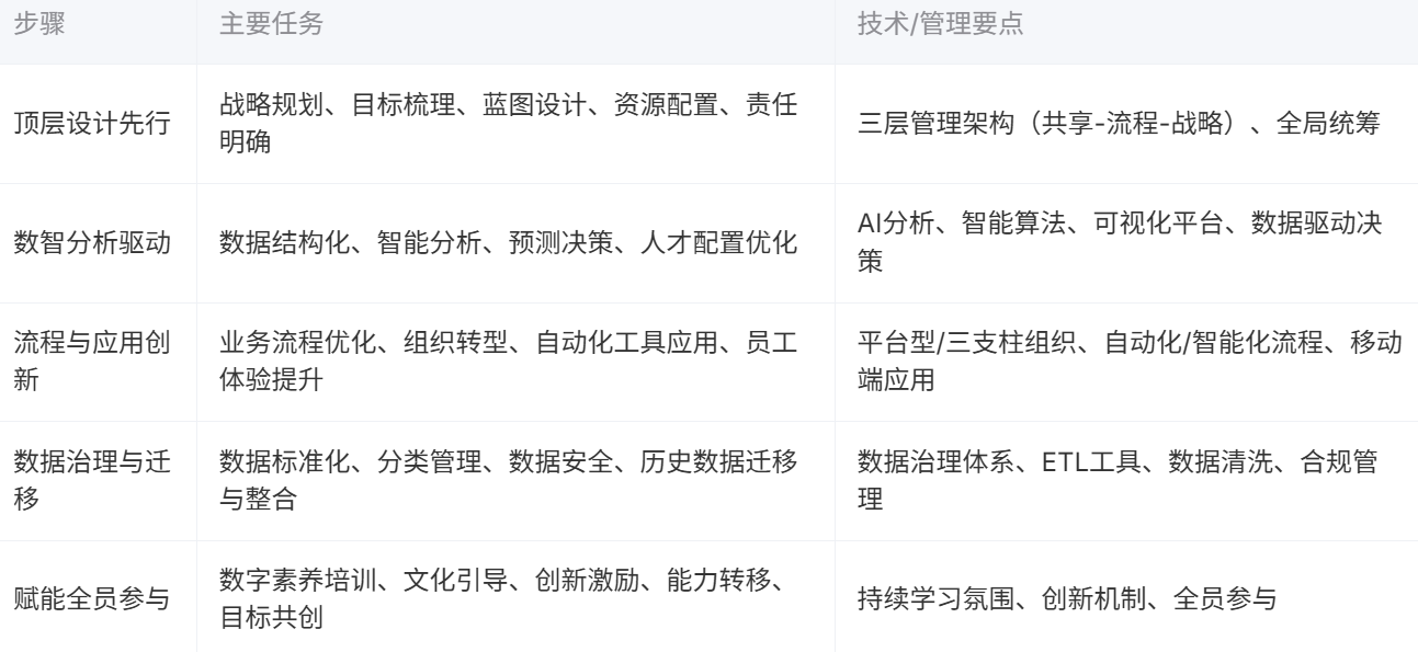国有企业人力资源数字化转型的核心,在于实现管理范式的全面升级与组织能力的系统提升。通过顶层设计的科学引领,企业能够明确转型方向、统筹资源配置,为后续各环节的高效协同和创新突破打下坚实基础。