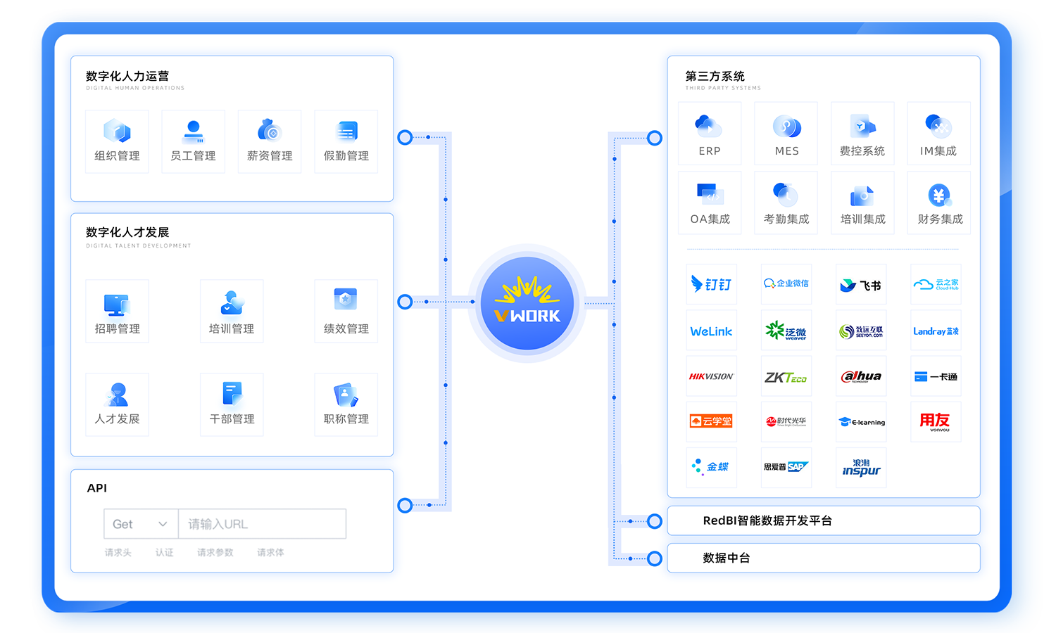 传统HR系统最大的瓶颈在于缺乏和企业其他系统之间的集成能力,导致信息孤立、数据重复录入和运转迟缓。红海云通过自主研发的RedAPI引擎,实现了HR系统与OA、财务、企业微信等上下游系统的无缝对接。企业的管理者无需为数据的跨系统同步再额外投入资源和人力。