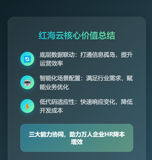 因此,万人企业必须采用全局化的HR系统进行数据贯通和流程优化,而红海云的一体化解决方案正是针对这一核心痛点而设计。