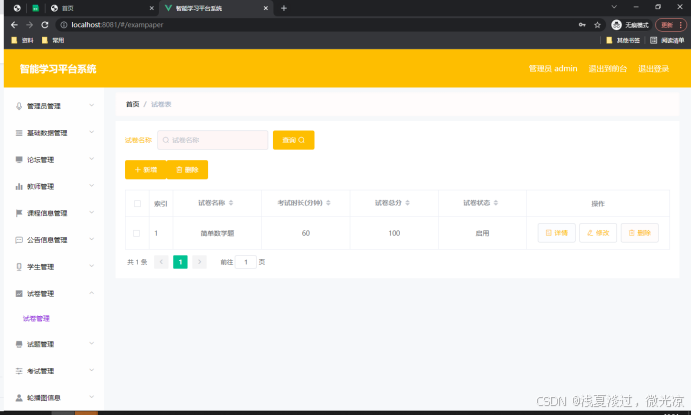 如图5.3显示的就是试卷信息管理页面,此页面提供给管理员的功能有:根据试卷信息进行条件查询,还可以对试卷信息进行新增、修改、查询操作等等。