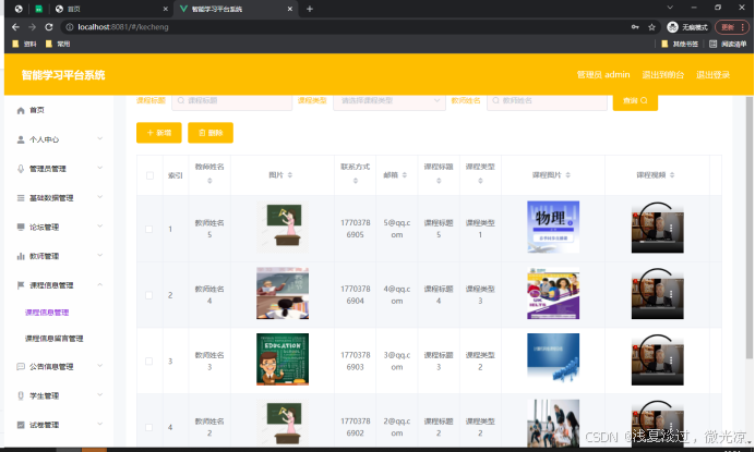 如图5.2显示的就是课程信息管理页面,此页面提供给管理员的功能有:查看已发布的课程信息数据,修改课程信息,课程信息作废,即可删除,还进行了对课程信息名称的模糊查询 课程信息信息的类型查询等等一些条件。