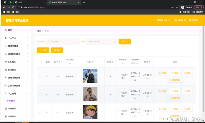 如图5.1显示的就是学生信息管理页面,此页面提供给管理员的功能有:学生信息的查询管理,可以删除学生信息、修改学生信息、新增学生信息,还进行了对用户名称的模糊查询的条件
