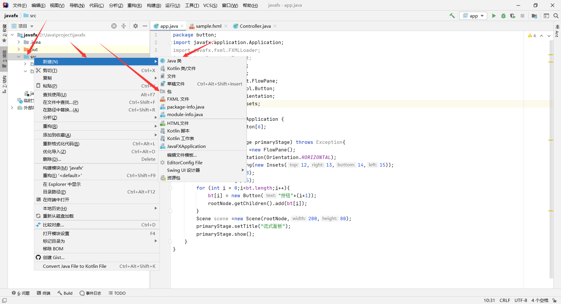 src新建一个package,然后右键新建一个class,选中包新建一个fxml文件,注意顺序