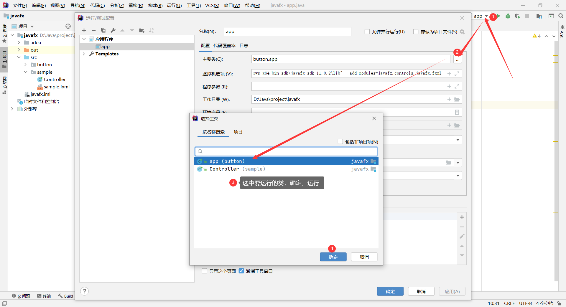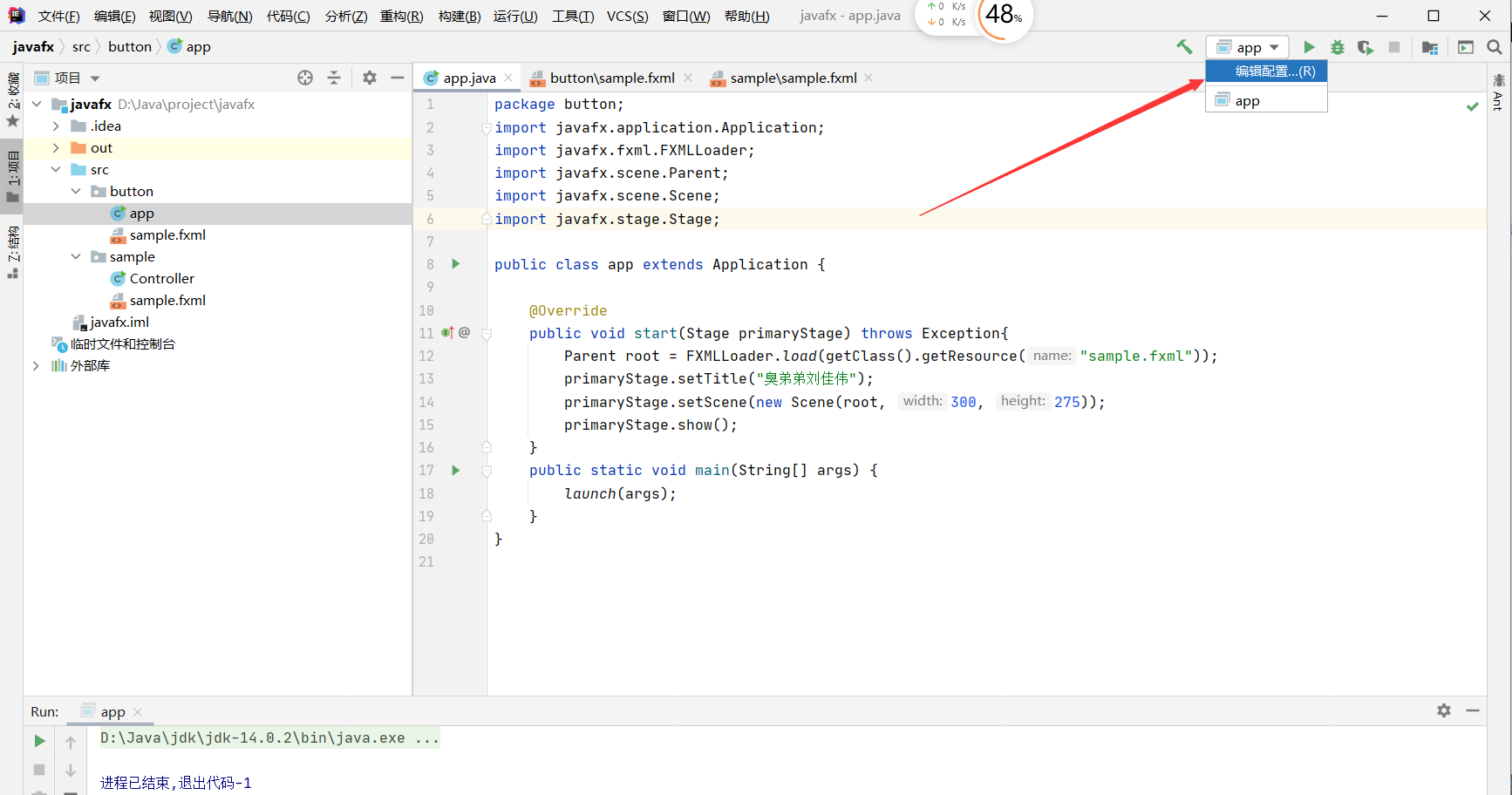 package包里面新建一个类和fxml文件,注意fxml文件中button.appbutton表示包名package,app表示类名class