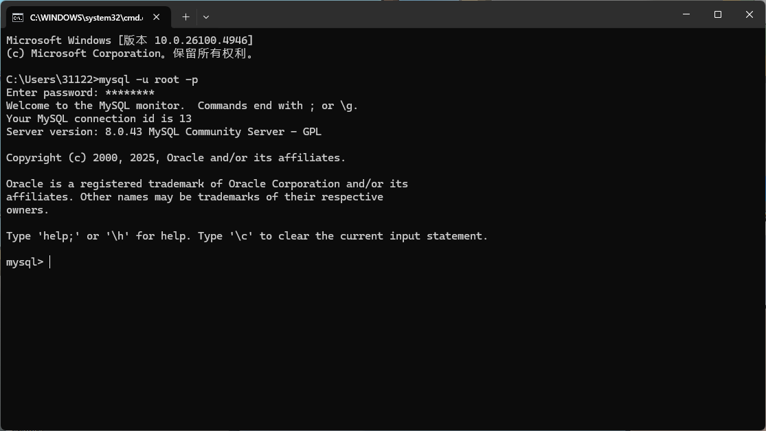 mysql -u root -p 命令行中登录指令(确保你的mysql已经配置到环境变量中)