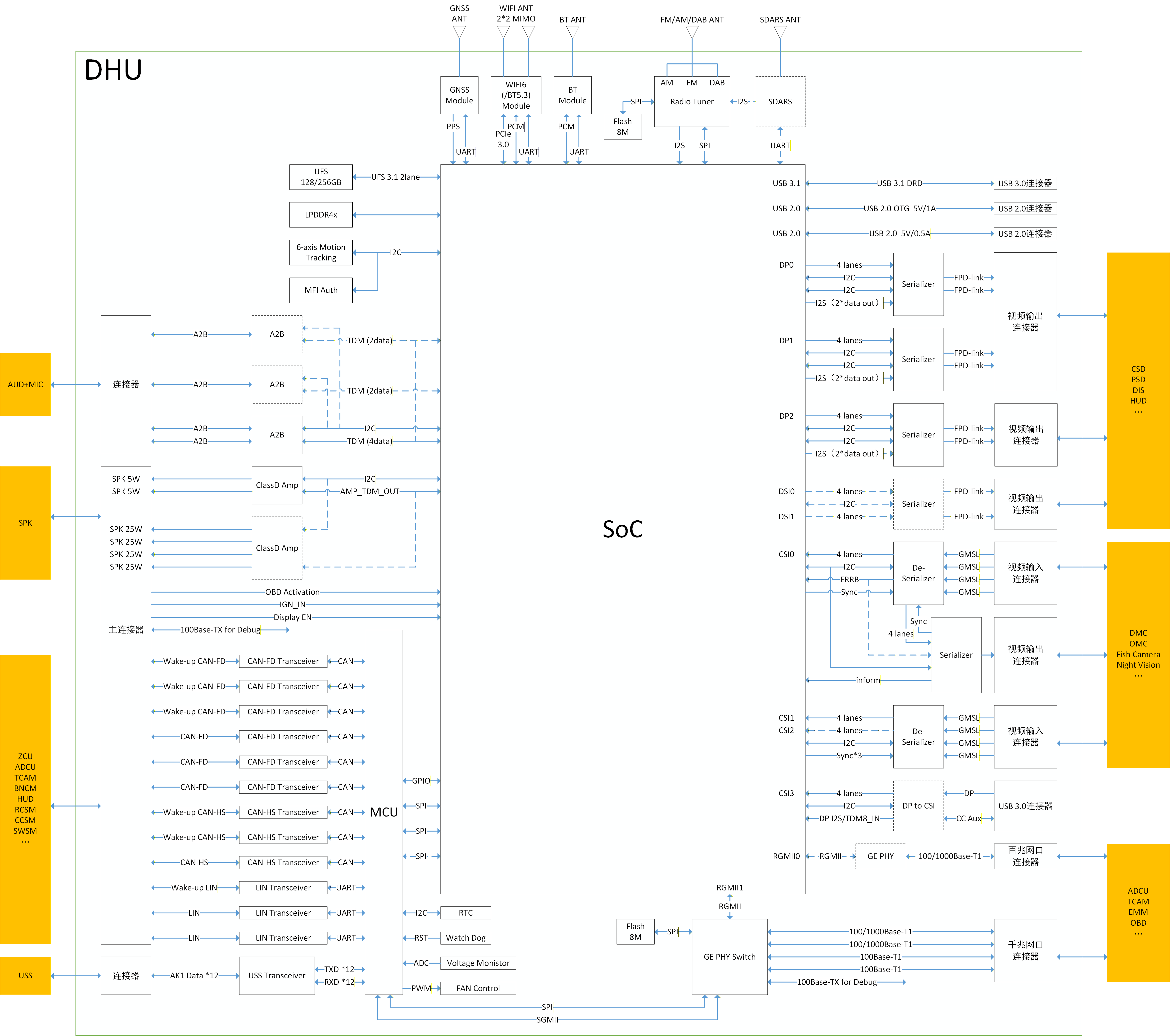 注:DHU与IHU(Infotainment Head Unit,车载信息娱乐主机)的主要区别在于是否接收驾驶信息。