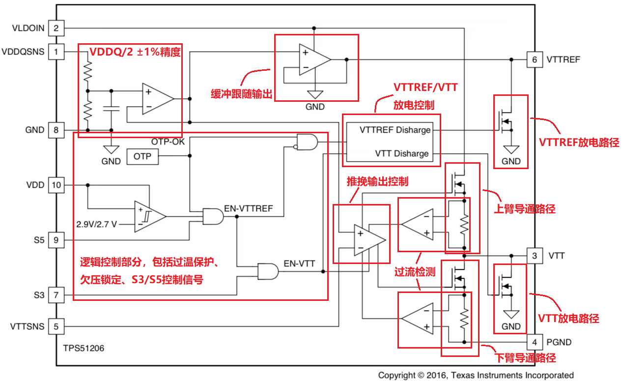 - 拉电流:当内存总线信号从低电平变为高电平时,总线需要从VTT电源“吸取”电流来充电。此时,TPS51206内部的上臂MOS功率管导通,将电流从VLDOIN源出,通过VTT引脚输送到总线上,表现为 “拉电流”。