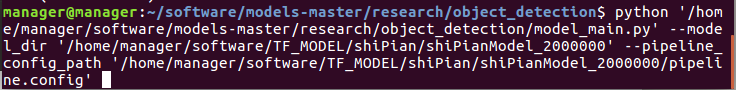 利用脚本文件model_main.py,该脚本文件位于文件夹/research/object_detection下,其中参数--model_dir指明训练出的模型的路径,--pipeline_config_path指定配置文件,该配置文件几乎涵盖了所有信息,包括训练数据、验证数据等
