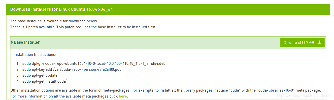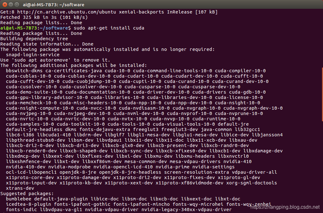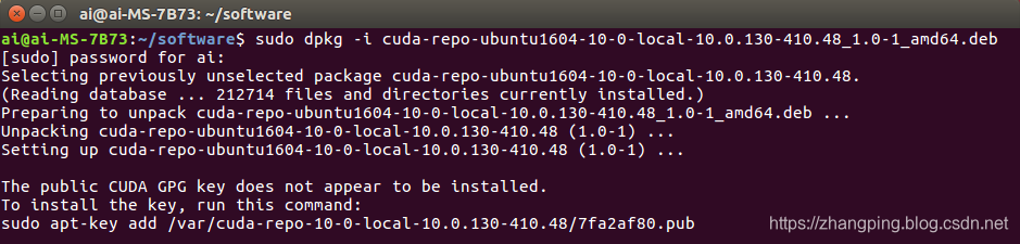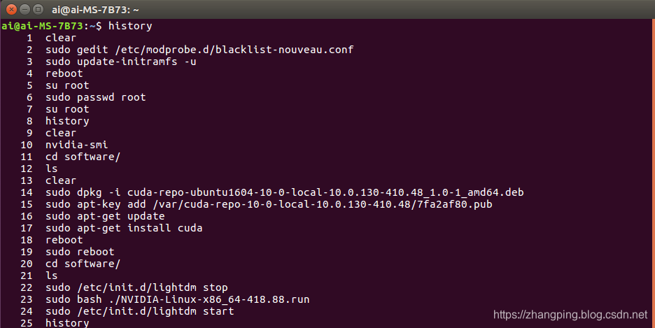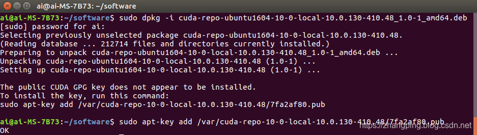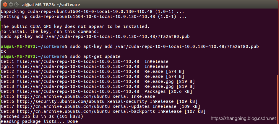 在使用runfile安装CUDA10时,始终安装不成功,所以尝试使用.deb文件安装,结果安装成功。